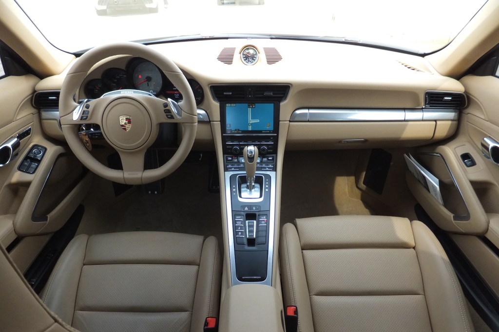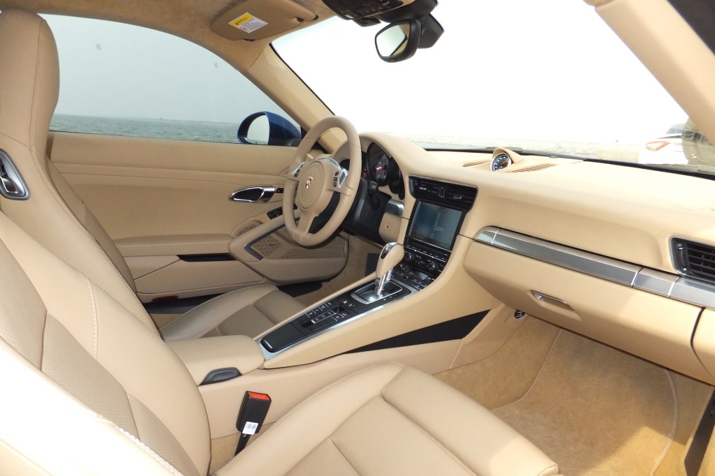 실내에서 클래식한 느낌이 남아있는 것은 5개의 원이 겹쳐진 계기판뿐이라고 해도 지나치지 않다. 앞서 등장한 파나메라와 카이엔 등에서 볼 수 있었던 디자인 흐름이 911에도 반영되어 있는데, 다른 포르쉐 모델들에 비하면 대시보드에서 곧게 뻗어 나와 좌우 좌석 사이를 가르는 부분은 2004년에 나온 카레라 GT의 느낌이 더 진하다. 물론 포르쉐 라인업의 최신 모델이라는 점은 디테일에서 은근하게 드러난다. 대표적인 것이 엔진 회전계 왼쪽에 놓인 멀티 디스플레이다. 화면 디자인은 다른 차들과 같지만 해상도는 훨씬 높아졌다.