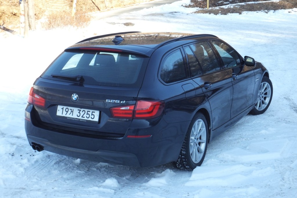 마른 듯해도 염화칼슘이 남아 있는 아스팔트를 네 바퀴가 움켜쥐고 가속도를 감내하는 차체, 그러는 가운데 동요 없이 깔끔하게 방향을 유지하도록 적당한 무게로 응답하는 스티어링 휠이 든든하다. BMW는 아니라고 하겠지만, 525d 투어링 x드라이브는 눈길보다는 아스팔트 위에서가 덜 밋밋하다. 타고난 유전자는 어디 가지 않는다.