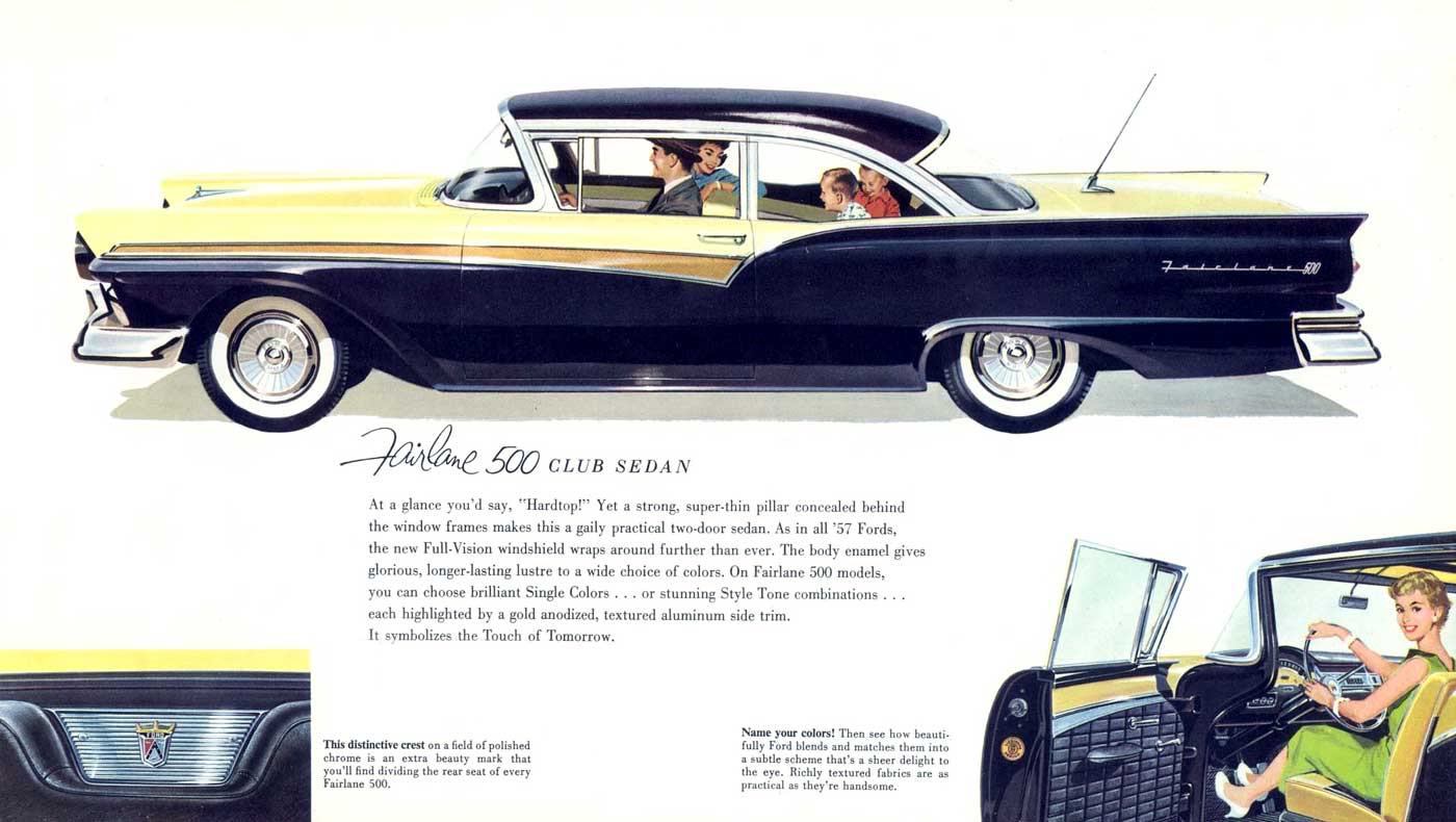 1950년대 중반에 시장 확대와 더불어 큰 규모의 업계 재편을 겪었던 미국 자동차 산업에서도 치열한 경쟁이 벌어졌습니다. 특히 풀 사이즈(full-size)라고 불리는 대형 세단이 미국 사회에 뿌리를 내리는 데 결정적인 영향을 미친 두 차가 큰 역할을 했습니다. 하나는 쉐보레 벨 에어(‘카 북’ 140쪽)였고, 다른 하나는 포드 페어레인(‘카 북’ 141쪽)이었습니다. 지금도 미국 시장에서 가장 많은 판매고를 올리고 있는 두 브랜드인 쉐보레와 포드의 경쟁구도가 본격화된 것도 이 두 차에서 시작되었다고 할 수 있습니다.