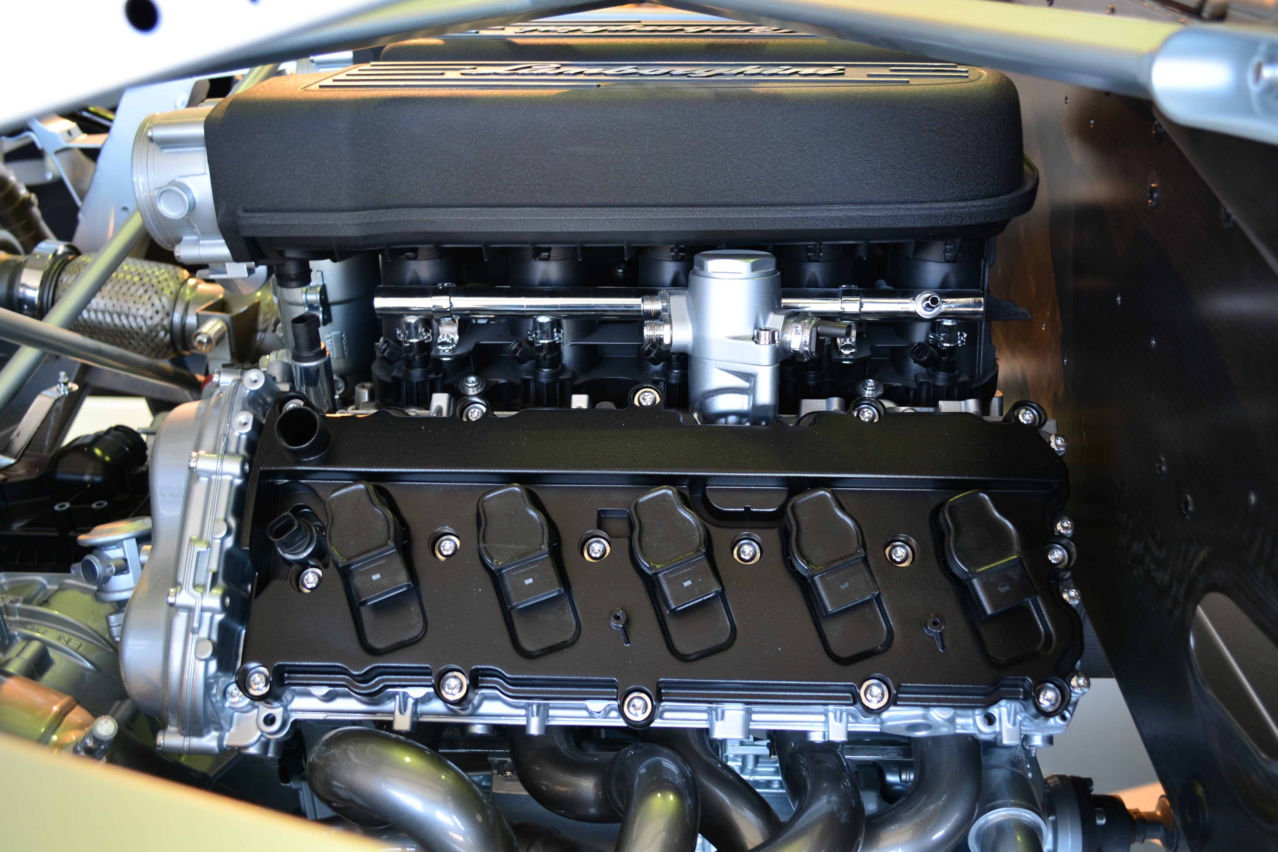 탄소섬유 소재로 된 벽을 사이에 두고 탑승공간 뒤에서는 가야르도의 것을 크게 개선한 V10 5.2리터 엔진이 열기를 뿜어냅니다. 요즘 유행하는 다운사이즈 터보가 아닌 자연흡기 방식입니다. 다운사이징이 대세라는 것은 람보르기니도 잘 알고 있습니다. 하지만 람보르기니는 자신들의 색깔에는 이런 자연흡기 엔진이 더 잘 맞는다고 판단했습니다. 그들이 굳이 이야기하지는 않지만, 높은 출력이라는 결과물만큼 그 결과물을 얻기 위한 과정도 중요시하기 때문일 겁니다. 그리고 이 엔진의 유연성은 우라칸의 특성을 뚜렷하게 만드는 일등공신이기도 합니다.