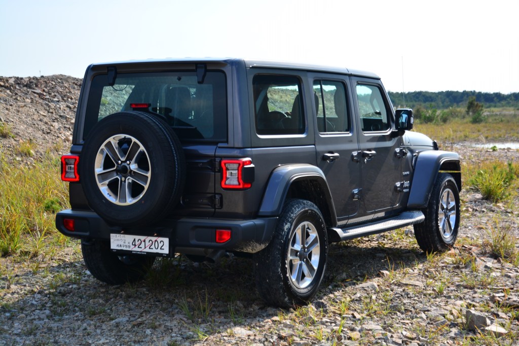 절묘하게 조절한 헤드램프와 7 슬롯 그릴의 비율, 헤드램프 부근에서 한 번 꺾이는 앞부분, 앞 펜더 앞에 가로 놓인 차폭등과 방향지시등은 두 세대 전 모델(TJ)과 비슷하다. 약간 부풀린 보닛 형태는 CJ-5와 CJ-7이 떠오른다. 7 슬롯 그릴 위에 돋을새김했던 ‘Jeep’라는 글씨는 사라졌다. 사각형으로 튀어나온 테일램프는 특이하게도 같은 브랜드 소형 SUV인 레니게이드와 비슷한 분위기다.