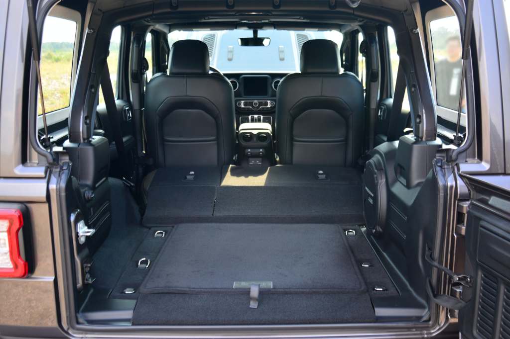 투박한 생김새와는 달리, 장비 배치는 기능에 충실하다. 도어와 지붕을 모두 떼어내 실내가 외부 환경에 노출되는 상황을 고려해, 파워 윈도 스위치는 센터 페시아와 센터 콘솔 뒤에 몰아 놓았다. 전자식 주차 브레이크 스위치는 물론, 주행 관련 기능을 조절하는 버튼과 스위치들은 모두 기어 레버 주변에 있다. 사하라 모델에는 센터 페시아 아래쪽에 스마트폰을 두기에 충분한 수납공간이 있는데, 루비콘 모델에서는 그 자리 절반을 디퍼렌셜 잠금 기능 작동 및 해제 스위치와 스웨이바 분리 및 체결 버튼이 차지한다. 컵 홀더 크기도 넉넉하고, 앞좌석 사이의 콘솔 박스는 표준 단렌즈를 끼운 DSLR 카메라를 넣을 수 있을 정도의 크기다. 도어와 지붕을 분리했을 때에도 탑승자를 보호할 수 있도록, 롤 케이지 형태의 구조물이 사람 타는 공간 바깥쪽을 두르고 있다. 롤 케이지 중 천장을 가로지르는 것들에는 오디오 스피커도 배치되어 있고, 좌석 있는 곳 주변은 안쪽을 내장재로 마감했다.