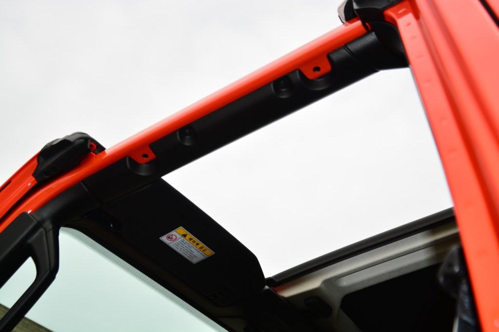 앞좌석 천장은 좌우가 분리되어, 각각 네 개의 고정장치만 손으로 풀면 한 사람만 있어도 쉽게 떼어내 타르가 톱처럼 만들 수 있다. 뒤쪽 천장도 차와 함께 제공되는 공구를 써서 볼트 몇 개를 풀고 전기장치 연결 커넥터를 분리하면 쉽게 떼어낼 수 있다. 물론 덩치와 무게 때문에 한 사람이 하기에는 무리다. 짐 공간에 접근할 수 있는 뒤 도어 턱 부분에는 도어와 지붕을 떼어내고 앞 유리를 앞으로 접을 때 분리하는 볼트를 끼워넣을 수 있는 구멍이 갯수에 맞춰 나 있다. 그 아래에는 타이어 교체 때 쓰는 잭이 들어 있다. 이곳저곳 쓰임새를 고려한 기능이 아기자기하게 자리를 잡고 있는 것이 재미있다.