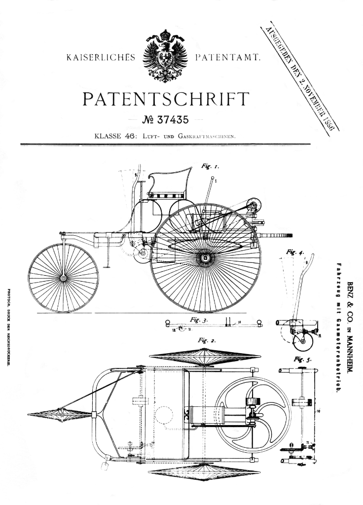역사상 첫 자동차가 무엇이냐에 관한 논란은 아직까지도 남아있지만, 가장 일반적으로 꼽는 것은 역시 벤츠 파텐트 모토바겐(Benz Patent Motorwagen)이다. 1885년에 카를 벤츠(Carl Benz)가 완성해 1886년에 특허 등록한 3륜차가 바로 그것이다. 당시에는 내연기관 이론을 바탕으로 실용화에 관한 연구가 다양하게 이루어지면서 원시적 형태의 2행정과 4행정 엔진이 하나둘씩 등장하고 있었다. 아울러 엔진을 이용한 탈것을 만들려고 시도한 사람도 많았다. 벤츠도 그 중 한 명이었다.
