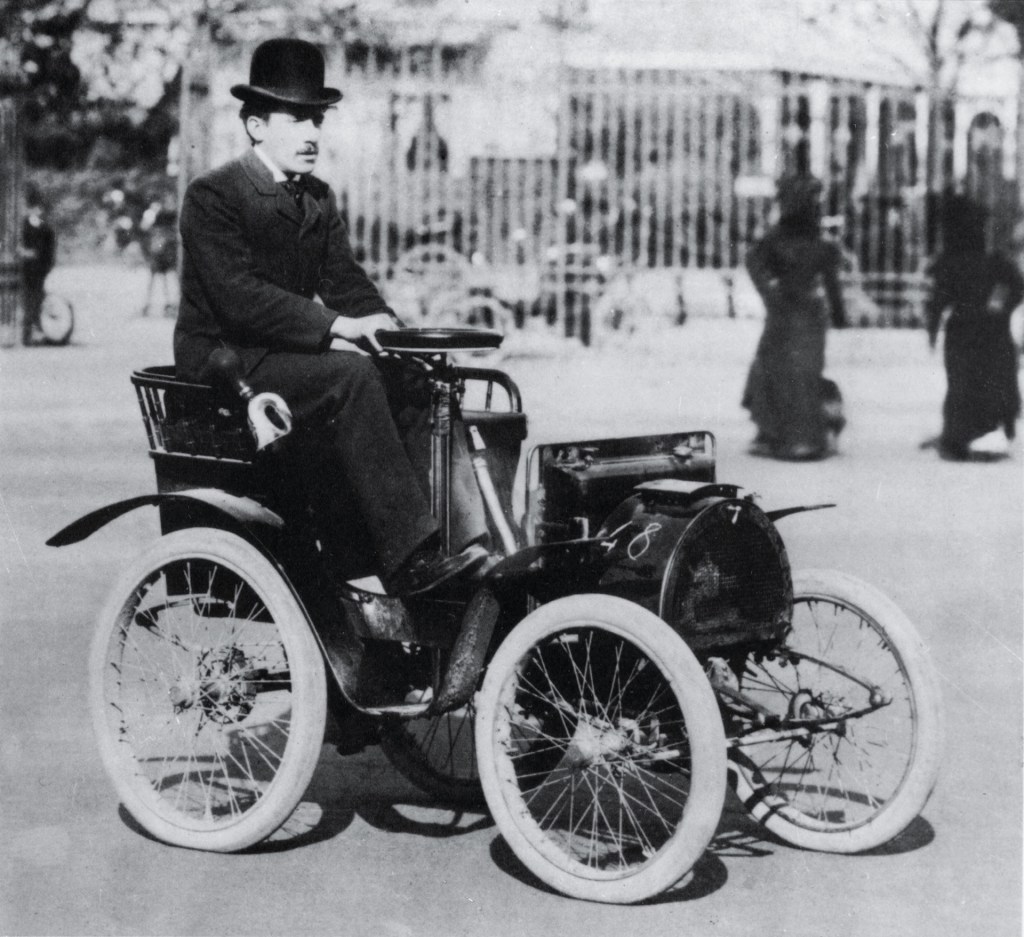 처음 완성한 차에 올라간 엔진은 드 디옹 부통(De Dion-Bouton)이 삼륜차에 쓰기 위해 만든 단기통 198cc로, 최고출력 0.75마력에 사이드 밸브와 점화코일 방식 점화 시스템이 쓰였다. 동력은 가죽 클러치와 체인을 통해 뒷바퀴로 전달되었다. 조향은 수직으로 곧게 선 스티어링 컬럼에 달린 반원형 스티어링 휠로 두 개의 앞바퀴를 조절해 이루어졌다. 앞뒤 차축에는 차체 길이 방향으로 반원형 판 스프링이 달려 있어 충격을 흡수했다.