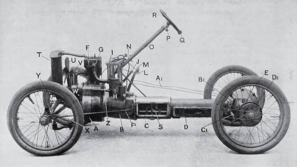 변속기는 전진 3단 후진 1단 구성으로, 이론상 1단과 후진 기어로는 시속 13 km(8마일), 2단으로는 시속 26 km(16마일), 3단으로는 시속 38 km(24마일)까지 달릴 수 있었다. 3단 기어는 기어비가 1:1이었다. 기어 레버는 스티어링 휠 아래에 있었고 스티어링 컬럼 주변의 동심 튜브를 통해 작동되었다. 스티어링은 스티어링 컬럼 옆에 있는 두 개의 케이블이 스티어링 컬럼 끝에 달린 장치를 통해 양쪽 바퀴에 연결된 스티어링 기구를 밀고 당겨 방향을 바꾸는 구조였다. 뒷바퀴에 있는 브레이크는 드럼 방식이었고, 발로 조절하는 페달과 케이블로 연결되어 작동했다.