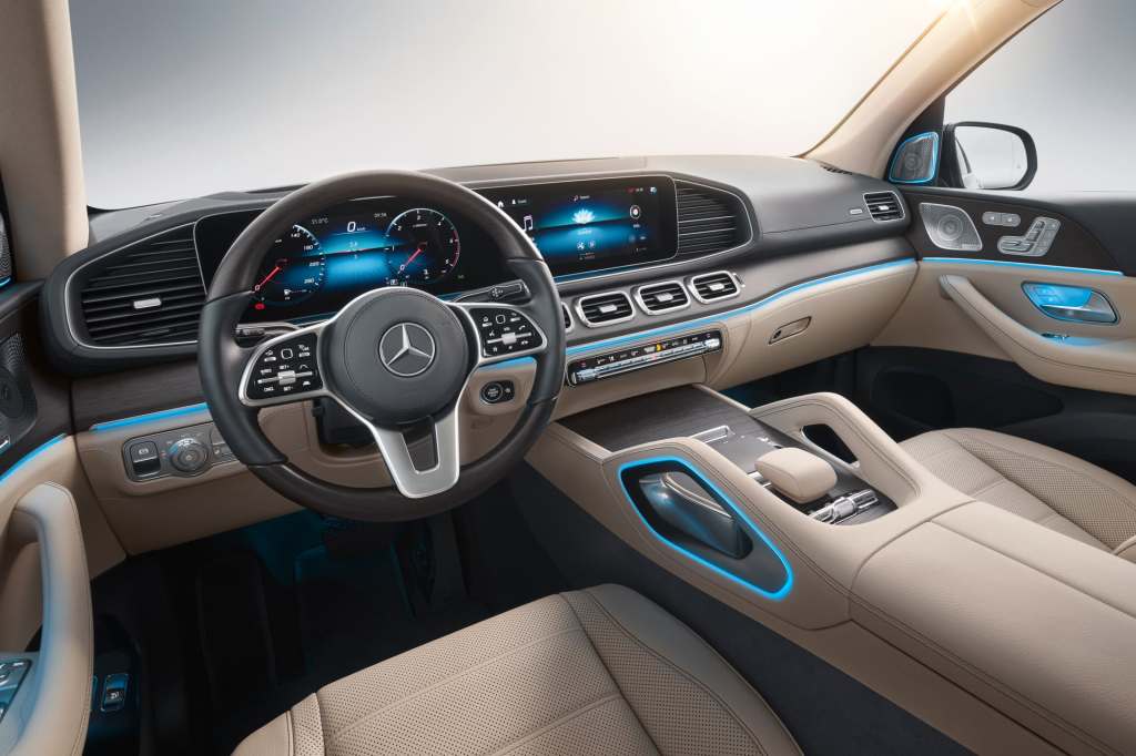 실내 디자인은 GLE-클래스와 거의 같다. 가로 방향으로 넓게 뻗은 대시보드는 계기판과 인포테인먼트 스크린이 이어진 대형 패널 좌우로 공기배출구가 놓여 있고, 인포테인먼트 스크린 아래에 네 개의 사각형 공기 배출구가 나란히 놓여 있다. 센터 콘솔은 터치 및 필기 인식이 가능한 커맨드 컨트롤러와 좌우에 돌출된 손잡이가 특징이다. 스티어링 휠은 다른 최신 메르세데스-벤츠 모델들처럼 터치 감응식 컨트롤러가 달린 형식이다. 계기판과 인포테인먼트 스크린은 모두 12.3인치 풀 컬러 LCD이고, 운전석 앞에는 헤드업 디스플레이(HUD)가 설치되어 있다.