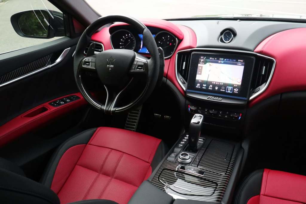 문을 열면 드러나는 실내도 겉모습처럼 빨간색과 검은색의 강렬한 색대비가 돋보인다. 빨간색과 검은색이 뚜렷하게 대비되는 내장재를 쓴 것은 마세라티 라인업 중 처음이라고 한다. 다른 기블리는 대시보드 부분에 빨간색과 검은색 조합을 선택할 수 있지만, 앞뒤 좌석과 도어 트림에도 이런 조합이 적용되는 것은 리벨레 에디션 뿐이다. 여기에 주요 부분을 카본으로 치장해 스포티한 분위기를 강조한다. 센터 콘솔의 카본 장식 위에는 ‘One of 30’이라는 한정판 배지가 붙어 있다.
