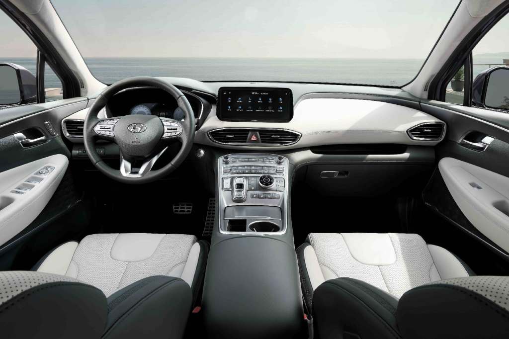 내부는 페이스리프트 이전 싼타페의 대시보드 디자인을 거의 그대로 유지한 대신 10.25인치(하위 트림은 8인치) 스크린 적용을 고려해 인포테인먼트 스크린 패널 크기를 키웠고, 대시보드 가운데 공기 배출구에서 앞좌석 사이의 콘솔 박스로 이어지는 센터 페시아 부분을 넥쏘, 팰리세이드 등과 비슷하게 경사진 플로팅 패널 형태로 바꿨다. 디자인 변화와 더불어 기어 레버는 변속 버튼으로 바뀌었고, 주행 모드 셀렉터와 HTRAC 선택 시 적용되는 험로주행 모드 셀렉터는 변속 버튼 왼쪽으로 배치했다. 센터 페시아와 기어 레버 주변에 있던 버튼 및 스위치도 재배열했다. 64색 선택이 가능한 앰비언트 무드 램프도 상위 트림의 선택 또는 기본사항에 추가되었다. 좌석은 2열 5인승이 기본이고 3열 7인승 구성을 선택할 수 있다.