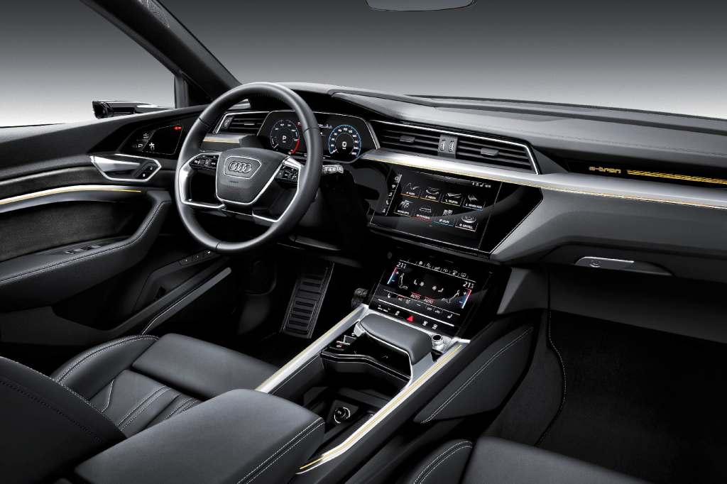 실내 디자인은 가로로 길게 뻗은 대시보드와 햅틱 피드백 기능이 있는 듀얼 터치 스크린 구성의 MMI 내비게이션 플러스 및 MMI 터치 리스폰스, 풀 LCD 계기판 중심의 버추얼 콕핏 플러스와 헤드업 디스플레이 등을 갖춰 A6/A7, Q7/Q8 등과 기본 구성이 비슷하다. 다만 계기판에는 엔진회전계 대신 모터 출력 및 회생제동 활동도를 표시하는 파워 미터가 표시되고, 스티어링 휠에는 회생제동 강도 조절 패들이 달려 있다. 기어 레버는 레버 전체가 아니라 고정된 받침대에 손을 올려놓았을 때 손가락이 닿는 부분만 조절되는 방식이다. 또한, 앞좌석 사이 센터 콘솔에는 깊이 파인 수납공간이 마련되어 있다.