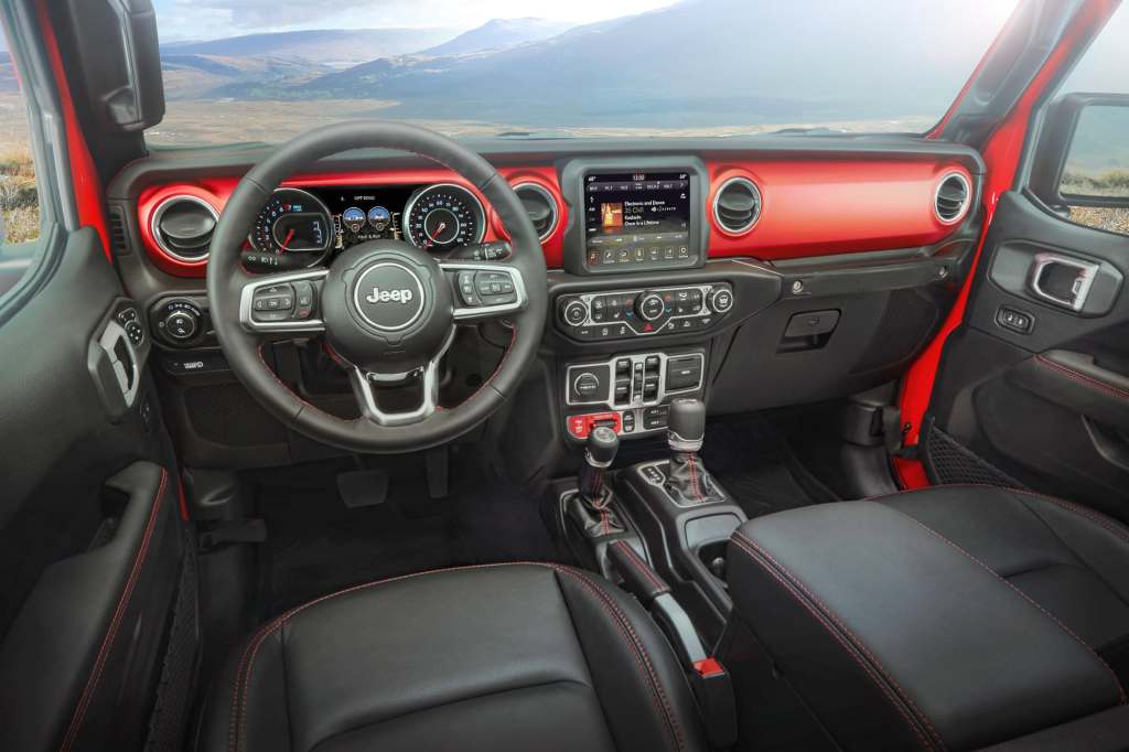 실내 꾸밈새와 장비 구성은 랭글러 루비콘 4도어와 거의 같다. 대시보드 가운데에는 8.4인치 터치스크린이 포함된 4세대 유커넥트(Uconnect) 인포테인먼트 시스템이 있고, 계기판은 두 개의 원형 아날로그 계기 사이에 7인치 다기능 컬러 디스플레이로 구성되어 있다. 국내 판매 모델에는 서브우퍼를 포함한 9개 스피커를 갖춘 알파인(Alpine) 프리미엄 오디오 시스템이 기본 사항에 포함된다.