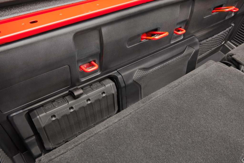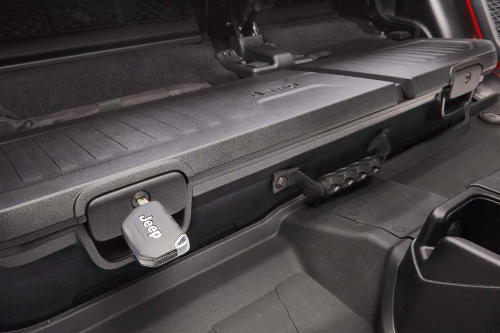 루비콘 4도어와 다른 점은 2열 좌석으로, 앉는 부분 아래에는 좌석과 마찬가지로 6:4 비율로 좌우가 나뉜 덮개 잠금식 수납공간이 있고 좌석 등받이를 앞으로 접으면 뒤쪽 바닥에 잠금 및 탈착 기능이 있는 수납공간이 있다. 좌석 뒤쪽 수납공간에는 휴대용 생활방수 블루투스 스피커가 있다.