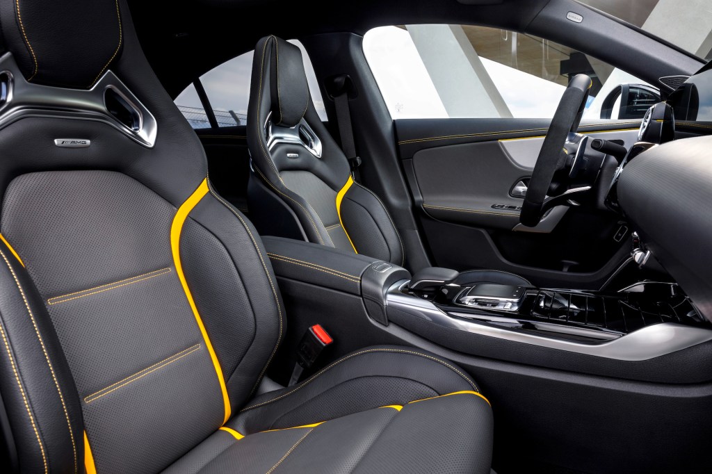 내부는 노란색을 재봉선 강조색으로 쓴 나파 가죽 내장재가 돋보이고, 등받이에 AMG 배지를 붙인 헤드레스트 일체형 스포츠 시트는 경주용 다점식 안전벨트가 통과하는 부분을 금속 분위기로 치장했다. 섀시 기능 및 주행 모드 조절용 스위치가 달린 D컷 스타일 AMG 다기능 스티어링 휠도 다른 내장재와 같은 주제로 꾸몄다. 하나의 틀 안에 넣은 계기판과 인포테인먼트 스크린은 모두 10.25인치 LCD이고, 계기판은 클래식, 스포츠, 슈퍼스포츠 중 하나의 테마를 선택해 표시할 수 있다. 헤드업 디스플레이에도 스포츠 주행 관련 정보를 표시할 수 있다.