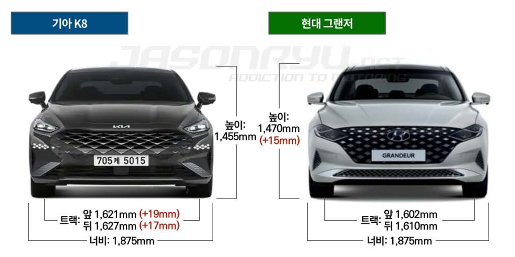 너비는 두 차가 같지만, 높이는 그랜저 쪽이 살짝 더 높습니다. 뒤쪽에 따로 정리해 놨듯, 휠베이스의 열세에도 높이 차이 덕분인지 실내 공간은 그랜저 쪽이 조금 더 우세한 항목도 있습니다. 앞뒤 트랙은 K8쪽이 조금 더 넓은데요. 두 차의 너비가 같은 만큼 천장이 낮고 트랙이 넓은 K8 쪽이 물리적 특성에서는 좀 더 안정적일 듯합니다.