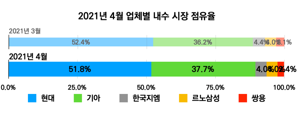 업체별 실적 발표 자료를 정리한 2021년 4월 국내 브랜드 내수 판매 실적 및 점유율입니다.