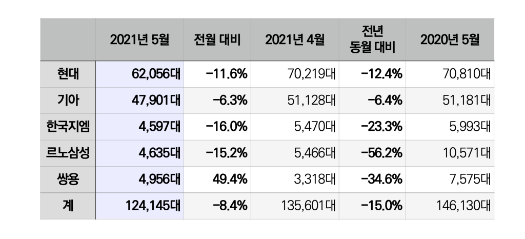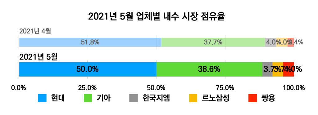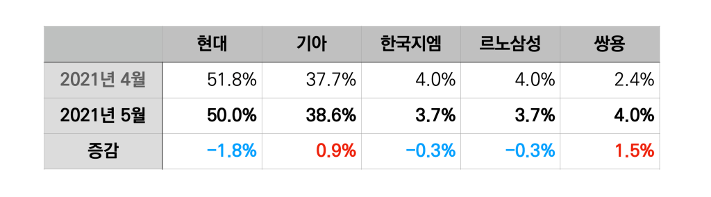 업체별 실적 발표 자료를 정리한 2021년 5월 국내 브랜드 내수 판매 실적 및 점유율입니다.