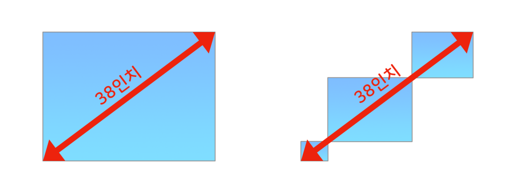 그런데 이걸 그냥 합산하는 게 무슨 소용이 있나요. 디스플레이를 인치 단위로 표현하는 건 가로나 세로 길이가 아니라 대각선 길이라는 건 이미 잘 알려진 사실이죠. 그러면 세 개 디스플레이를 대각선으로 늘어놓고 그 길이가 38인치니까 38인치 디스플레이다?