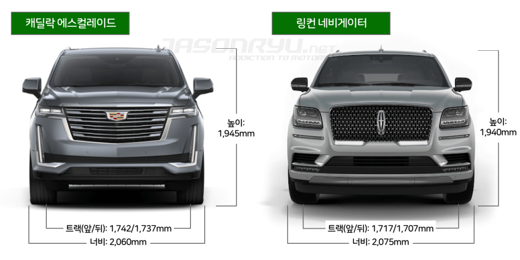너비 역시 에스컬레이드가 이전 세대보다 15mm 넓어지긴 했는데, 네비게이터보다는 15mm 좁습니다. 대신 에스컬레이드의 높이는 이전보다 45mm 높아져 네비게이터를 넘어섰습니다. 물론 그 차이는 5mm에 불과하지만요.