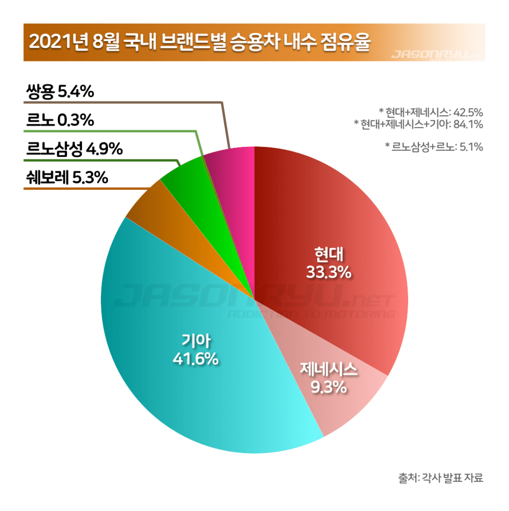 2021년 8월 국내 브랜드별 승용차 내수 판매 실적 및 점유율입니다. (출처: 각사 발표 자료)