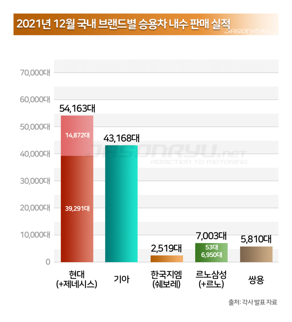 2021년 12월 국내 브랜드별 승용차 내수 판매 실적 및 점유율입니다.
