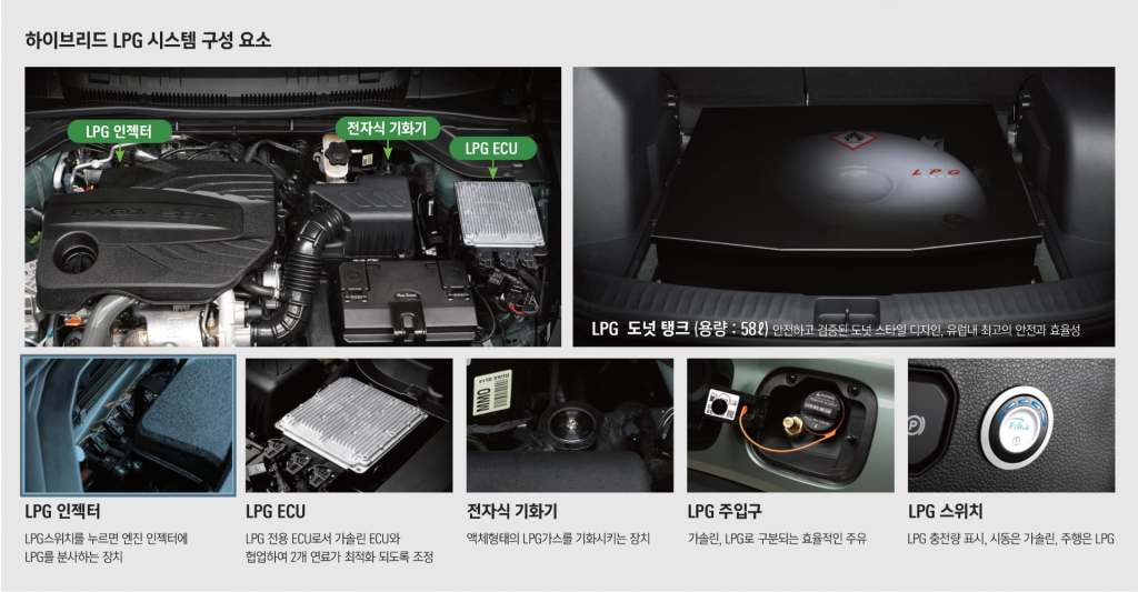 사실 토레스 하이브리드 LPG에 쓰인 기술은 특별히 새로운 건 아닙니다. 기아가 2011년에 내놓았던 모닝 바이퓨얼(Bi-Fuel)과 비슷한 개념이죠. 가솔린 엔진 자체는 거의 그대로 쓰고, LPG 연료를 쓸 수 있도록 LPG 탱크, LPG 분사를 위한 전용 ECU(전자제어 장치)와 기화기, LPG 인젝터, 사용 연료 전환을 위한 시스템 등 일부 요소가 추가됩니다.