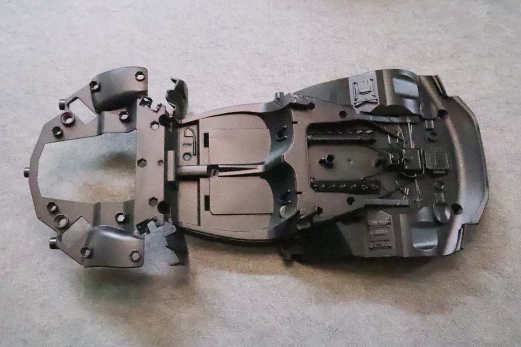 실내 부품 구성은 아주 단순합니다. 실차에서 카본 재질을 쓴 부분들을 차체 외부 부품들처럼 표면 가공을 하지 않았지만 형태 재현은 투박하게나마 잘 했고요. 조립도 아주 쉽게 할 수 있습니다. 스티커 붙이기가 좀 불편할 뿐, 최소한의 부품으로 최대한 효과를 낼 수 있게 만들었습니다. 이 부분 역시 살짝 디테일을 더하거나 칠을 하면 훨씬 더 그럴싸하게 보완할 수 있을 듯합니다.