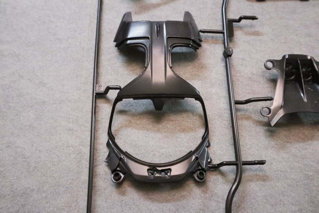 지붕이나 도어 위쪽, 앞뒤 스포일러, 사이드 미러 등 실차에서 카본 재질이 그대로 노출된 부분은 검은색 부품에 가는 사선을 넣어 아주 단순하게 질감을 표현했습니다. 그냥 보기에는 나쁘지 않은데, 나중에 스티커를 붙일 때에는 밀착이 잘 되지 않는 것을 알 수 있었습니다. 사선을 양각이 아닌 음각으로 넣었다면 좀 나았을 텐데, 그런 것까지 신경 쓰자니 금형 가공 비용이 쓸데없이 많이 들어갔겠죠. 근본적인 성격이 완구인 제품이니까 이 정도 선에서 타협한 듯합니다.