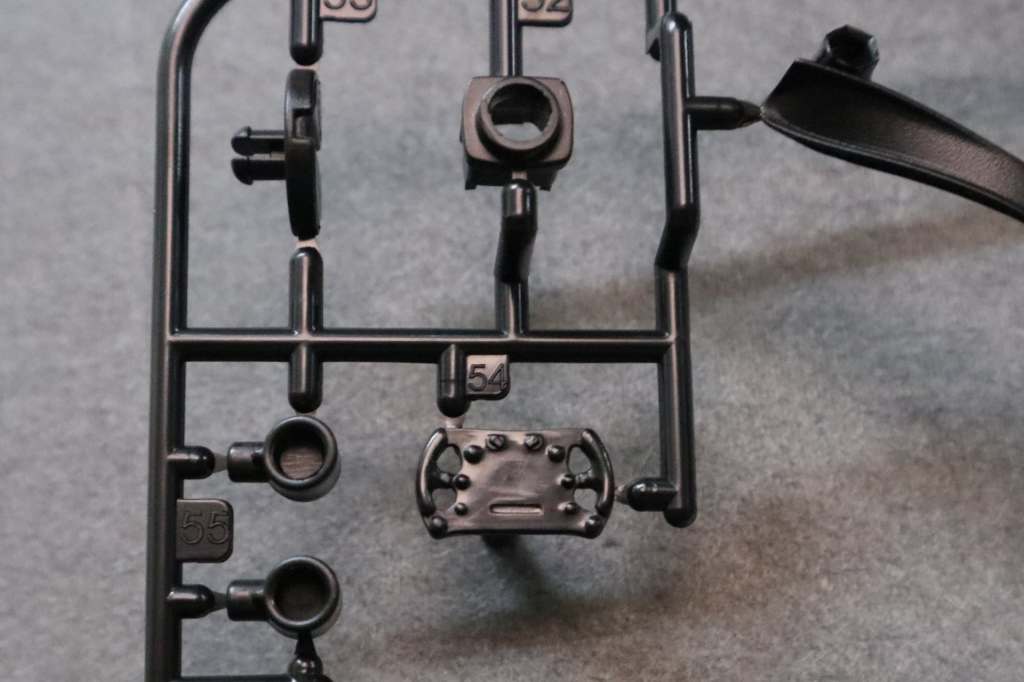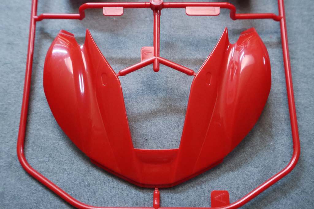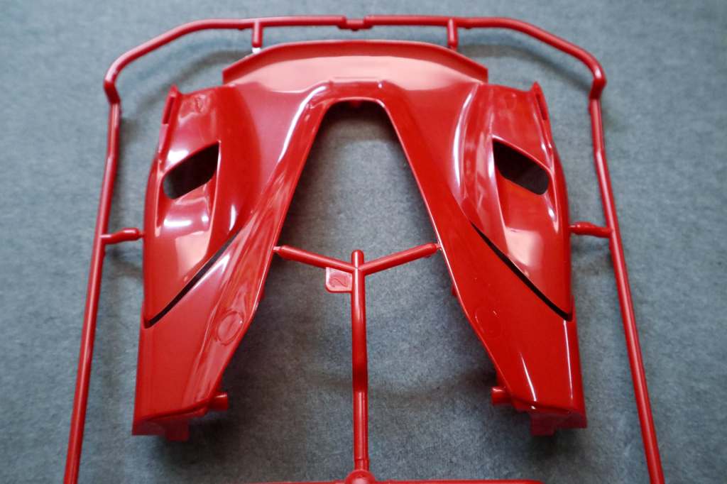 차체는 모형화의 바탕이 된 54번 차를 재현하면서 부품을 빨간색으로 사출했습니다. 일반 프라모델에 비해 부품이 꽤 두꺼운 편이고 재질이 좀 더 딱딱합니다. 대신 차체의 오묘하고 복잡한 곡선을 살리기 위해 상당히 신경써서 부품을 분할한 느낌이 듭니다. 일단은 그냥 만들어봤는데, 다 만들고 나니 아무래도 칠을 하는 쪽이 나았겠다는 생각이 들더군요.