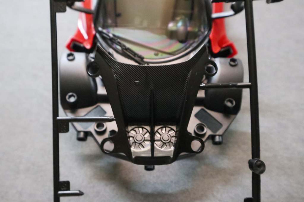실차에서 카본 재질이 드러나 있는 후드와 앞쪽에서 들어온 공기를 위로 뽑아내는 팬도 겉에서 볼 수 있는 부품이어서 무늬만이라도 재현해 놓은 것을 볼 수 있습니다. 팬 날개가 대칭인 것에는 신경을 썼네요.