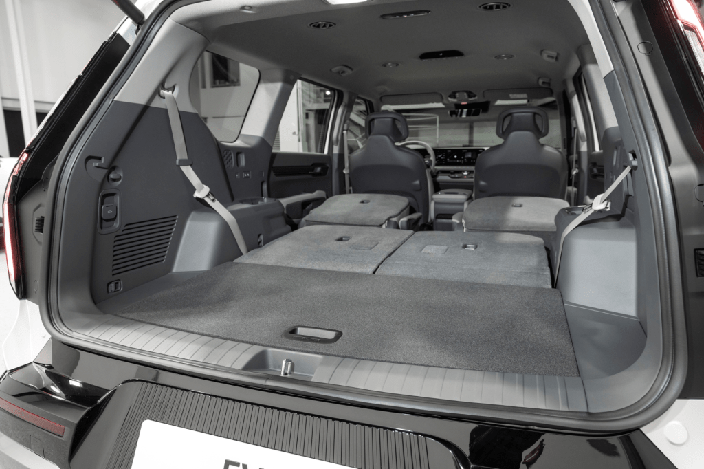 아울러 차체에 비해 긴 휠베이스와 짧은 오버행, 겉모습에서도 개방감을 느낄 수 있도록 벨트라인을 낮게 3열 좌석 위치까지 곧게 이은 뒤 위로 끌어올렸습니다. D 필러에서 아래쪽이 위로 솟아올라 루프 스포일러와 이어지도록 처리한 것은 앞서 출시된 EV6과도 닮았네요.