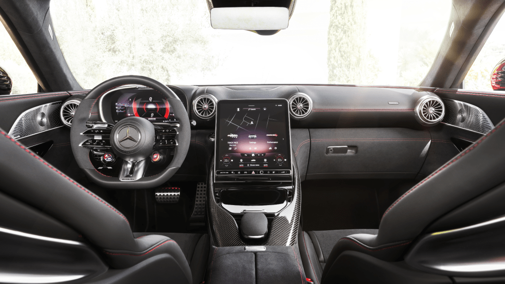실내는 SL-클래스의 시발점인 300 SL에서 영감을 얻어, 아날로그와 최첨단 디지털 요소를 결합한하이퍼아날로그(hyperanalogue)를 구현했다는 것이 메르세데스-벤츠의 주장입니다. 제트 엔진의 터빈 노즐을 형상화한 송풍구 디자인과 도어 트림과 이어지듯 디자인해 실내를 감싸는 듯한 분위기의 대시보드 위쪽, 기능적 요소를 최소화해 간결하게 꾸민 센터 페시아 등이 하이퍼아날로그 주제를 구현한 주요 특징들입니다. 아울러 계기판에는 12.3인치 디스플레이, 인포테인먼트 스크린에는 세로형 11.9인치 디스플레이를 쓰고 있습니다.