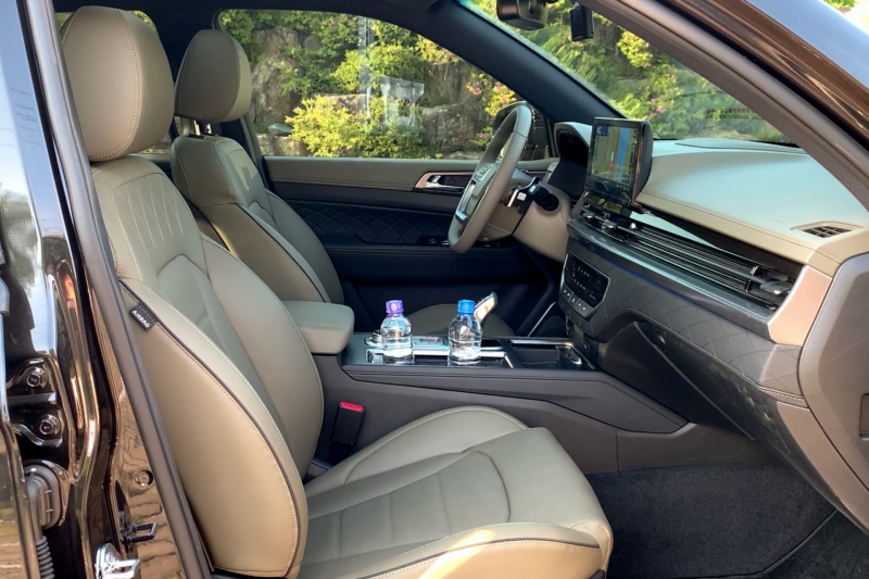 눈길을 끄는 요소 중 하나는 내장재 색이다. 시승차에는 렉스턴 뉴 아레나에서 새로 추가된 카키색 가죽 내장재가 쓰였는데, 색을 잘 조절해 촌스럽지 않고 고급스러워 보인다. 카키색 말고도 클래시컬 베이지와 마룬레드(스웨이드 퀼팅)가 내장재 색으로 새로 선보였는데, 마찬가지로 실내 분위기를 고급스럽게 만든다. 다만 도어 트림 위쪽과 대시보드 위쪽에는 가죽이 아닌 소프트스킨 재질이 쓰였는데, 밝은 카키색 내장재에서 대시보드 위쪽 모서리의 스티치 부분이 가짜 티가 두드러지는 것이 아쉽다.
