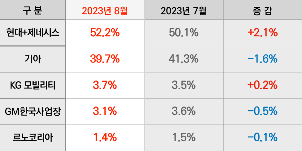 내수 시장 점유율은 제네시스를 포함한 현대가 소폭 늘어난 덕분에 다른 업체 비율이 조금씩 줄었습니다. 그럼에도 현대자동차그룹의 시장 점유율은 7월(91.4%)보다 커진 91.9%였습니다. 한편 8월 판매량이 7월과 비슷한 수준을 유지한 KG 모빌리티를 제외하면 GM한국사업장과 르노코리아 모두 점유율이 소폭 줄었습니다.