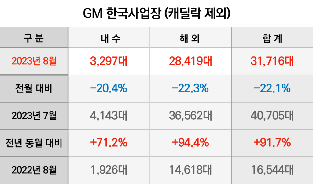 GM 한국사업장(캐딜락 제외)는 8월 한 달동안 내수 3,297대, 해외 2만 8,419대를 합쳐 모두 3만 1,716대(완성차 기준)를 판매했습니다. 7월보다 내수는 20.4%, 수출은 22.1% 줄어들어 감소세가 이어졌습니다.