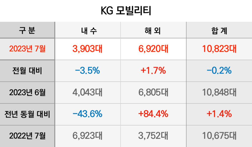 KG 모빌리티는 8월 한 달동안 내수 3,903대, 수출 6,920대를 합쳐 모두 10,823대를 판매했습니다. 내수와 수출 모두 전달과 비슷한 수준으로, 내수 판매량은 3.5% 줄었지만 수출량은 1.7% 늘었습니다. 전체 판매량은 0.2% 줄어든 선에서 마무리했습니다.