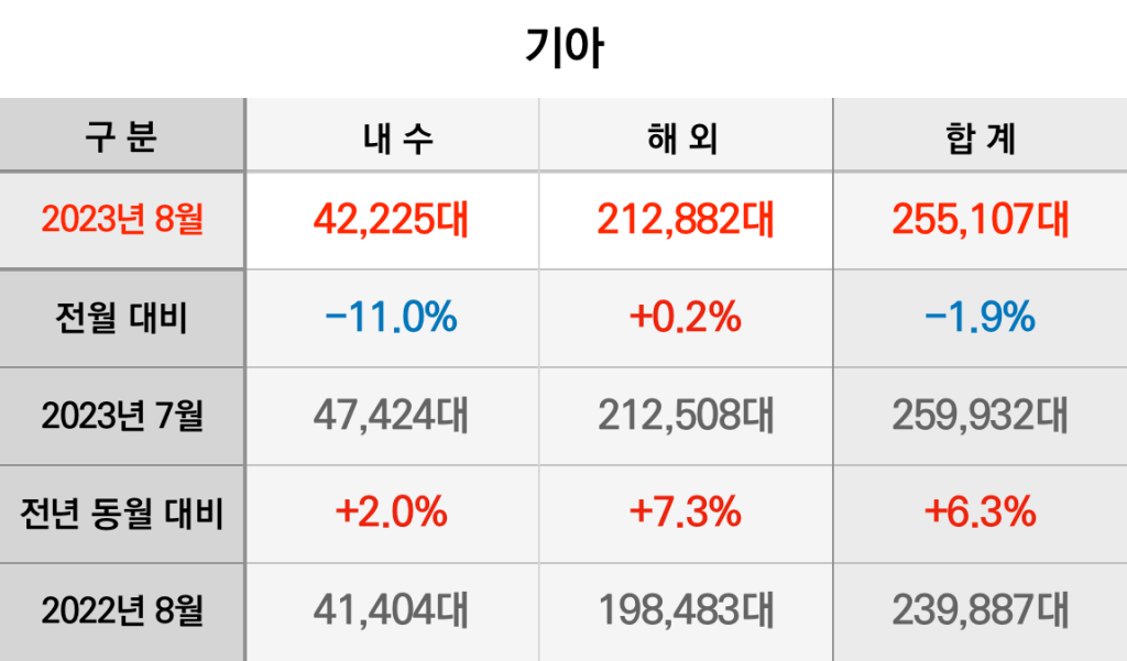 기아는 8월 한 달동안 내수 4만 2,225대, 해외 21만 2,882대, 특수 374대를 합쳐 모두 25만 5,481대를 판매했습니다. 2022년 8월보다 내수 판매는 2.4%, 해외는 5.8% 늘었습니다(특수 판매 제외).