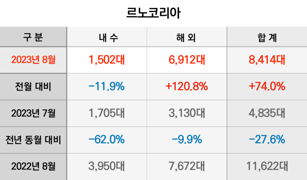 르노코리아자동차는 8월 한 달동안 내수 1,502대, 수출 6,912대를 합쳐 모두 8,414대를 판매했습니다. 수출은 7월보다 두 배 이상 늘었지만 내수는 2023년 최저치를 갈아치웠습니다.