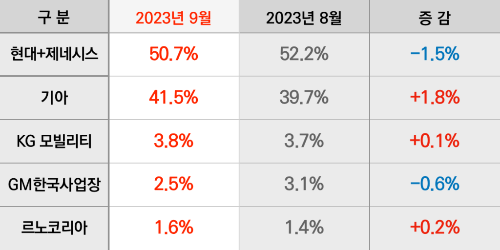 내수 시장 점유율은 제네시스를 포함한 현대가 소폭 줄었지만, 기아가 비슷한 규모로 늘어난 덕분에 현대자동차그룹 계열 브랜드 전체 점유율은 8월보다 0.3% 커진 92.2%가 되었습니다. 나머지 7.8%를 세 개 업체가 나눠 갖고 있다는 뜻이죠. 이렇게 시장이 한쪽으로 쏠려 있는데도 시장 과점에 대한 이야기를 하는 언론이나 전문가들은 별로 없습니다. 다만 전달보다 판매가 줄어든 GM한국사업장을 제외하면 나머지 두 개 업체는 판매량과 시장점유율 모두 소폭 늘었습니다.