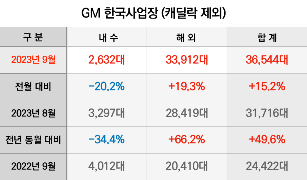 GM 한국사업장(캐딜락 제외)는 9월 한 달동안 내수 2,522대, 해외 3만 3,912대를 합쳐 모두 3만 6,544대(완성차 기준)를 판매했습니다. 8월보다 수출은 19.3% 늘었지만 내수는 20.2% 줄었습니다.
