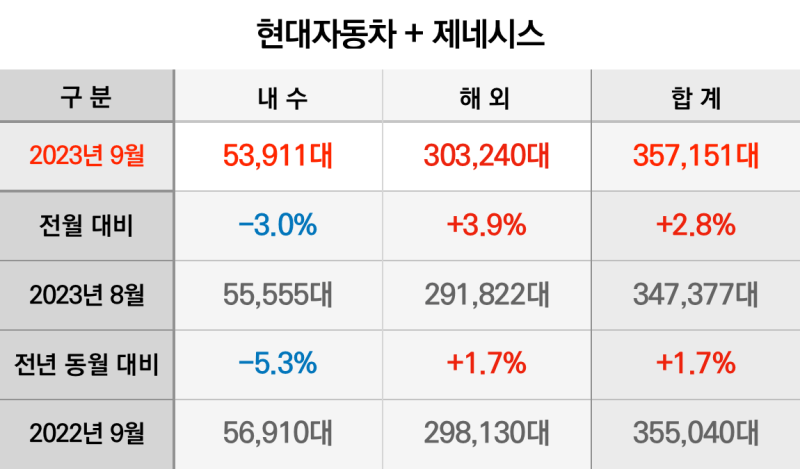 현대자동차는 9월 한 달동안 내수 5만 3,911대, 해외 30만 3,240대를 합쳐 모두 35만 7,151대를 판매했습니다. 2023년 8월보다는 내수(-3.0%)는 소폭 줄었지만, 해외 판매(+3.9%)는 늘었습니다.