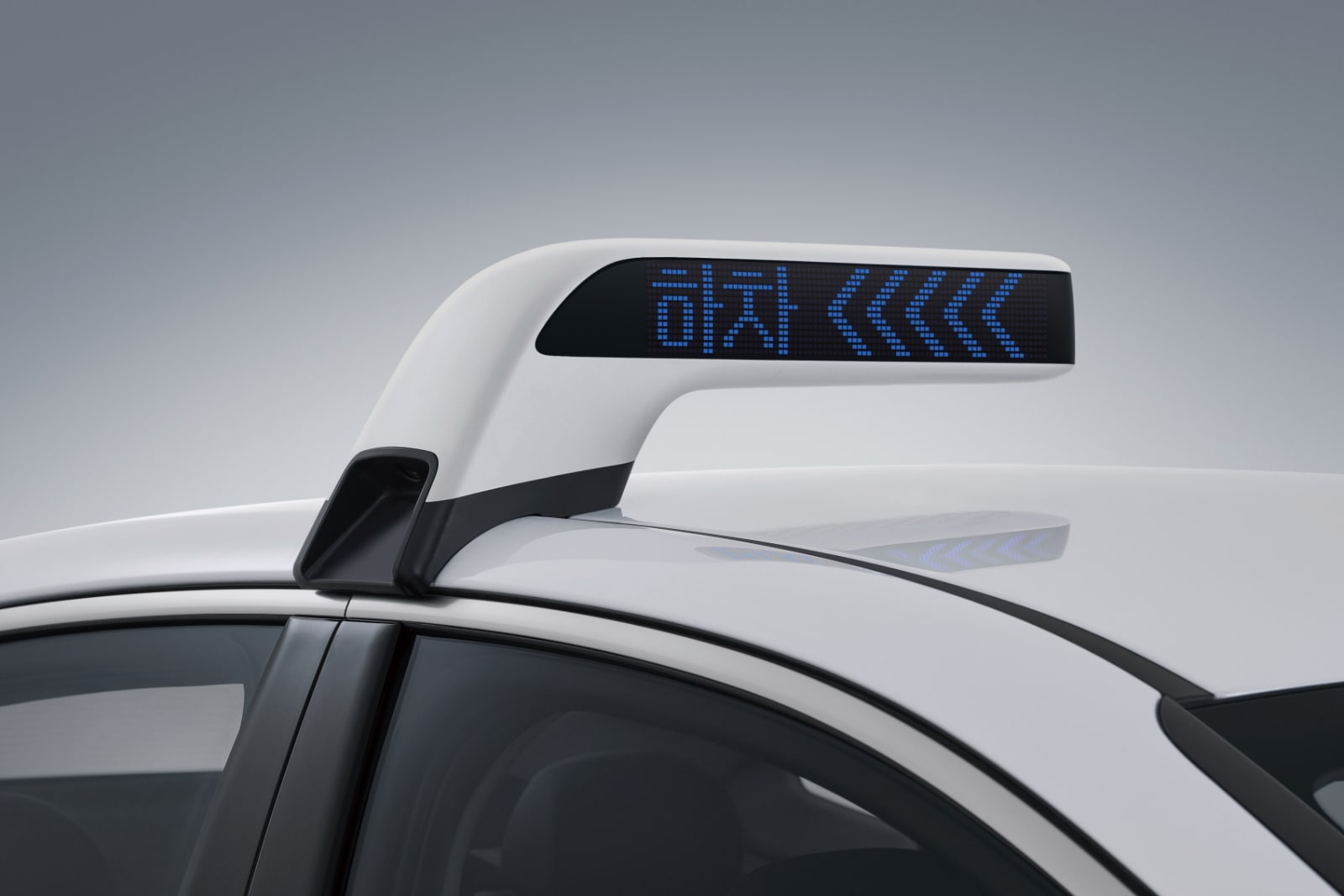 현대차는 쏘나타 택시를 출시하면서 택시 용품 업계와 협업해 새로운 디자인으로 만든 ‘스마트 택시 표시등’을 함께 선보였습니다. 택시에 설치해야 하는 택시 표시 및 공차 표시등을 통합한 제품으로, 지붕 가운데에 설치하는 일반 택시 표시등과 달리 동반석 B 필러 위쪽 지붕 가장자리에 설치하고, 디자인도 ㄱ자 모양이어서 색다른 느낌을 줍니다.