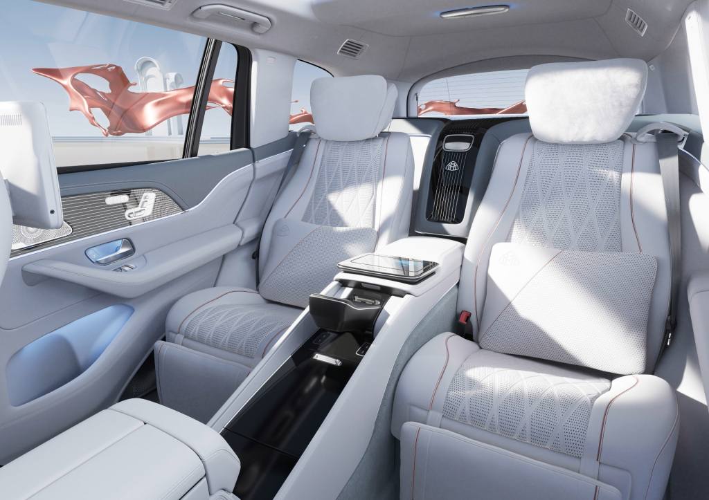 뒷좌석을 위한 편의 사항으로는 전동 리클라이닝 기능으로 등받이를 최대 43.5도까지 기울일 수 있고 다리 받침대도 있는 최고급 나파 가죽 이그제큐티브 시트, 뒷좌석 전동식 사이드 윈도우 선블라인드, 앞좌석 등받이 뒤에 개별적으로 11.6인치 터치스크린이 설치되는 MBUX 뒷좌석 엔터테인먼트 시스템, 무선 헤드셋 한 쌍, 7.4인치 탈착식 MBUX 뒷좌석 태블릿 등이 마련됩니다.