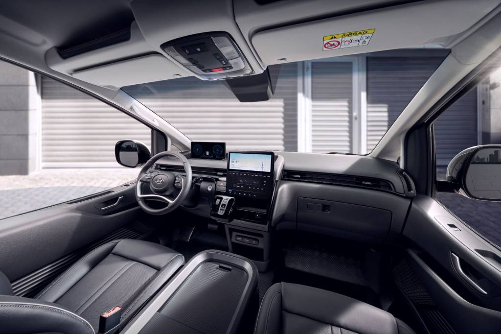 실내는 스타리아 카고와 디자인과 장비 구성이 거의 같습니다. 차이가 있다면 운전석 앞에 설치된 LCD 계기판의 크기가 12.3인치고 스타리아와 달리 주변 장식이 없는 직사각형이라는 점과 계기판 및 10.25인치 인포테인먼트 스크린의 인터페이스가 최신 ccNC가 아니라는 점을 들 수 있습니다. 전기 동력계를 쓰는 만큼 기어 셀렉터는 전자식인데, 최근 현대 승용 모델에 대부분 쓰이고 있는 스티어링 컬럼 토글 스위치식이 아니라 대시보드에 설치된 버튼식이라는 점이 눈길을 끕니다.