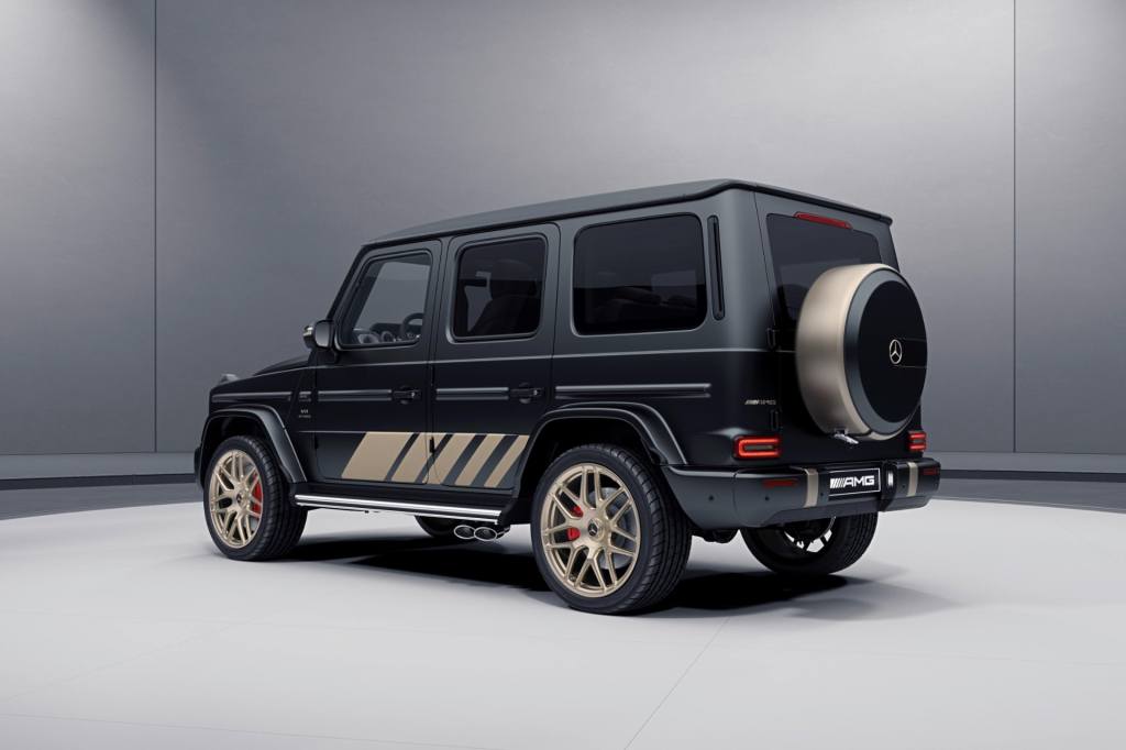 차체는 마누팍투어 프로그램의 무광 검은색을 바탕으로 차체 옆 아래쪽에 금색 AMG 그랜드 에디션 데칼을 붙여 강렬한 분위기를 냅니다. 그와 더불어 차체 외부에 단 AMG 로고와 메르세데스-벤츠 세 꼭지 별 로고, 22인치 AMG 단조 휠, 보닛 위의 AMG 엠블럼, 차체 뒤쪽 스페어 휠 테두리 등도 금색으로 마감 처리했습니다. 아울러 AMG 나이트 패키지가 기본 사항에 포함되어, AMG 전용 라디에이터 그릴과 헤드램프 및 방향지시등, 사이드 미러, 언더 가드 등 주요 장식적 요소들을 검은색으로 마감했습니다.