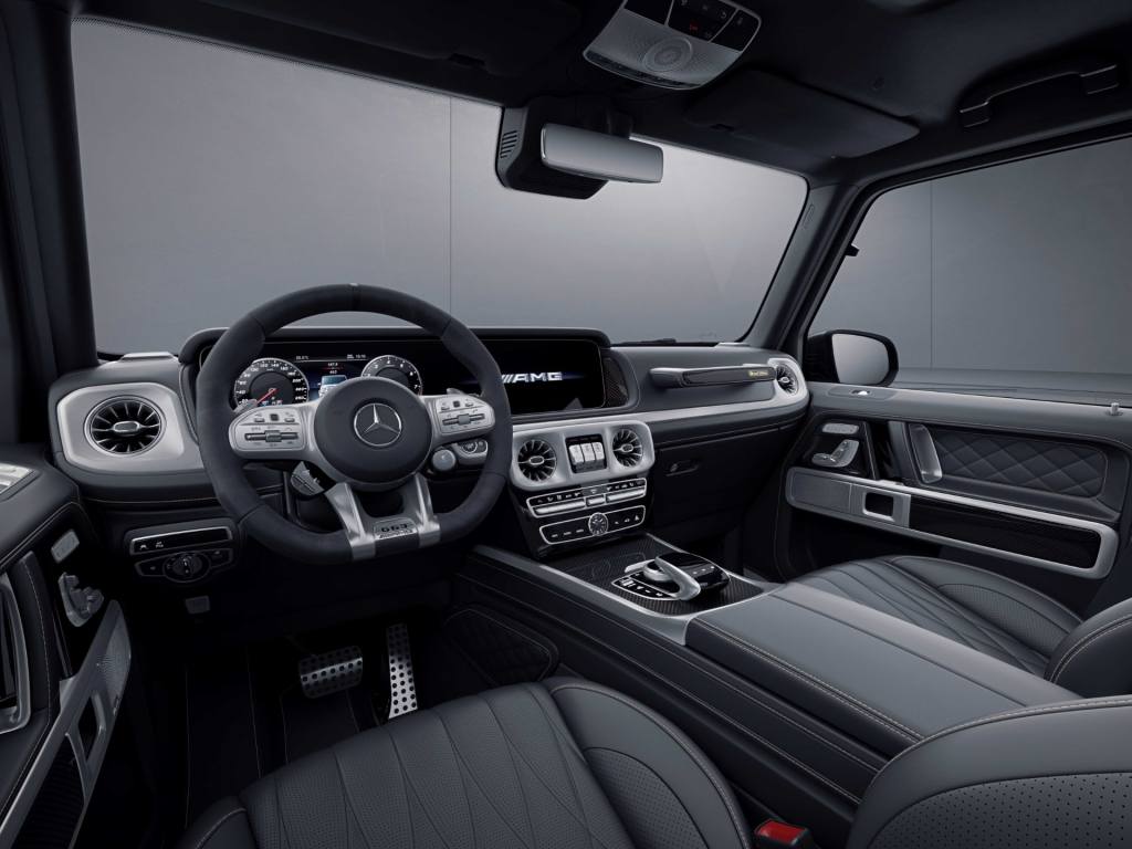 주제색인 검은색과 금색은 실내에도 반영되었습니다. 차체색과 조화를 이루는 검은색 G 마누팍투어 나파 가죽 시트, 내장재 곳곳에 쓰인 금색 스티치, ‘그랜드 에디션’ 배지 트림 몰딩 등이 눈길을 끌고요. 디나미카 극세사(DINAMICA microfiber) 소재로 감싼 AMG 퍼포먼스 스티어링 휠과 더불어 실내 곳곳에 자리를 잡은 AMG 카본 트림은 스포티하면서 고급스러운 분위기를 냅니다.