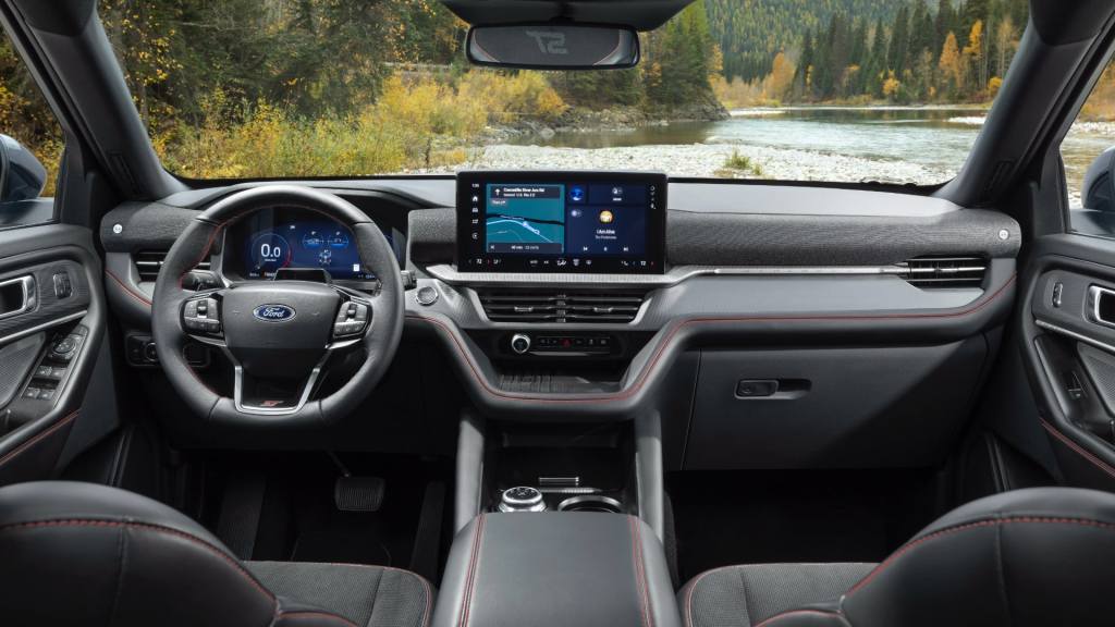 실내는 대시보드 디자인이 크게 바뀌었습니다. 대시보드 한가운데 놓이는 인포테인먼트 스크린은 포드 디지털 익스피리언스(Ford Digital Experience) 적용과 더불어 13.2인치로 대형화되면서 공기배출구가 인포테인먼트 스크린 아래로 자리를 옮겼고, 그와 더불어 좌우 공기배출구도 얇아져 대시보드를 가로지르는 디자인 요소에 통합되었습니다. 또한 센터 페시아의 물리적 조작부가 작아지면서 수납공간이 늘어났습니다.