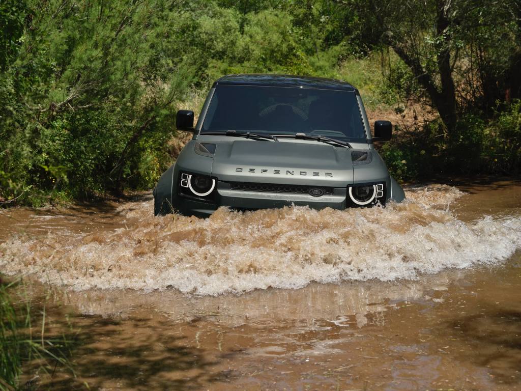 스타일은 올 뉴 디펜더를 바탕으로 주행 특성을 한층 더 강화한 설계를 반영해 차별화된 요소가 더해졌습니다. 지상고는 28mm, 너비는 68mm 커졌고, 험로 주행을 고려해 앞뒤 범퍼를 재설계함으로써 접근각과 이탈각을 키웠습니다. 또한 휠 아치를 넓히고 하체 보호 능력을 보강했고, 글로스 블랙(유광 검은색) 처리한 앞 그릴과 네 개의 배기구로 강력한 이미지를 부여했습니다.