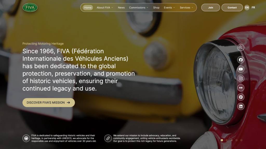 1966년에 설립된 FIVA는 클래식카 소유자, 열성적인 애호가, 일반 대중 모두의 이익을 위해 30년 이상 된 기계식 차량을 도로에서 안전하게 사용하도록 장려하는 것’을 주요 이념으로 삼고 있습니다. 또한, ‘정책 및 법률, 당국과의 협조를 통해 역사적 차의 책임감 있는 사용 및 보호’, ‘연구 및 목록 작성을 포함한 역사적 차, 관련 유물 및 기록 보존’, ‘국제 행사, 포럼 및 세미나를 포함한 역사적 차 문화 홍보’를 목표와 목적으로 활동하고 있습니다.