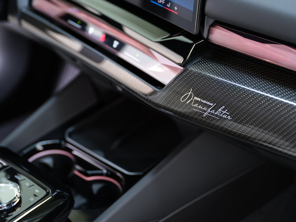 실내에는 최고급 내장재인 BMW 인디비주얼 그란 루쏘 메리노 가죽을 써서 꾸몄고, 나이트 블루와 오팔 화이트 색상의 우아한 조화를 통해 고급감을 높였습니다. 또한 M 카본 파이버 인테리어 트림과 실버 스티칭, 실내 곳곳에 들어간 BMW 인디비주얼 마누팍투어 로고 등이 돋보입니다.